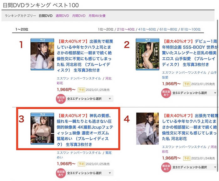 数字会说话,鹫尾めい(鹫尾芽衣)本来就很卖,这支冠上神乳之名的作品一出就稳坐S1第二档老三的位置ー不是鹫尾还不够强,而是河北彩花和山手梨爱两人根本怪物,鹫尾能坚守老三、在昨天的销售排行榜也只输那两位高手可说是超强了⋯